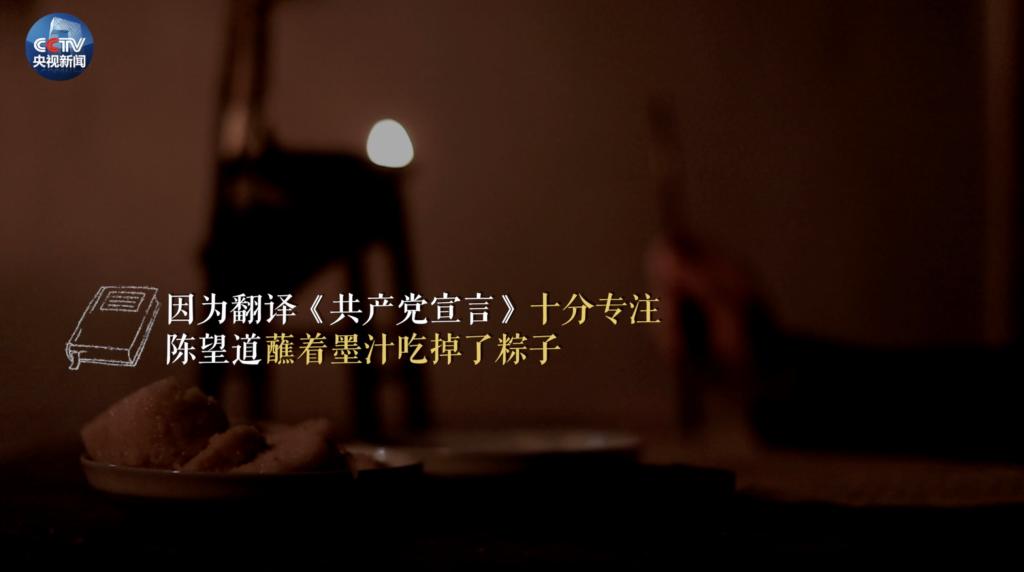 2012年11月29日,习近平在带领十八届中共中央政治局常委参观《复兴之路》展览时,曾生动地讲述陈望道翻译《共产党宣言》时因为过分专注,误把墨汁当成红糖吃下去的故事。“一天一个小伙子在家里奋笔疾书,妈妈在外面喊着说:‘你吃粽子要加红糖水,吃了吗?’他说:‘吃了吃了,甜极了。’结果老太太进门一看,这个小伙子埋头写书,嘴上全是黑墨水。真理味道非常甜!”