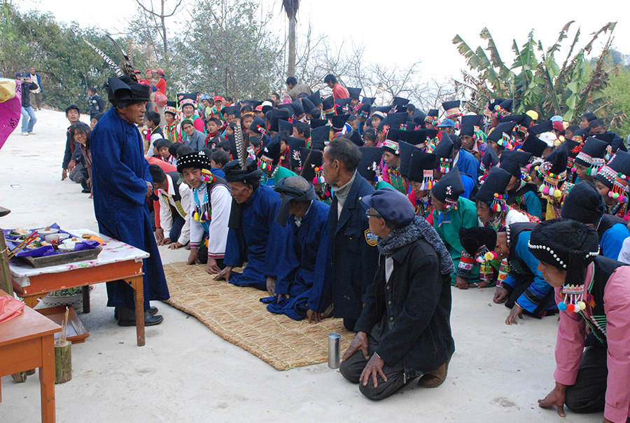 祭祀活动在广场上设置两个神坛,一个祭祀祖先,一个供奉天地。五位头人身着长袍,头戴头冠,引导群众歌舞祭祀。在祭祀结束时,四村五寨来参加活动的群众跪拜祖先和天地,以保一年四季平安、五谷丰登、六畜兴旺。