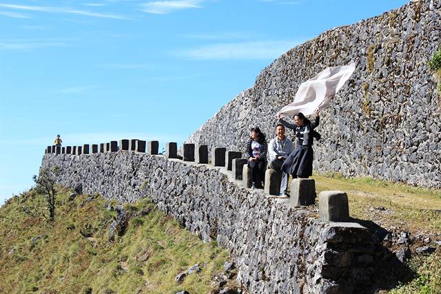 在大水河头山山顶,有一个直径200多米的深坑,深坑周围长满了各种高海拔树种,坑中低洼的地块是绿茵草甸。据当地的布朗族牧羊人说,这里曾经是一个大火山口,火山口周边还有高高的、奇形怪状的坚硬的岩石。为了方便放牧,居住在周围的布朗族群众祖辈就用这些坚硬的岩石垒成长长的石墙。走在斑驳的城墙边,踏上高高的石长城,静静听风,任何尘世俗缘都随风而去,不挂心,不留痕。而暮然回头,草地间游移的羊群和低首的骏马,却又让豪情万丈的坚毅大山显得格外温柔。