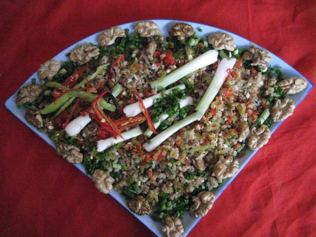【制作方法】将鲜核桃仁取出,放入适量青、红辣椒、葱、姜、芫荽、食盐倒入石臼捣碎,将制作好的调料与捣碎物拌匀,放置餐盘,油炸部分核桃仁放于餐盘周围即可食用。