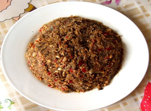 【制作方法】将小鱼焙黄,将青辣椒、青麻椒、苤菜根、食盐捣碎成糊状即可食用。