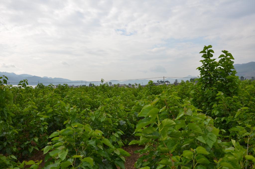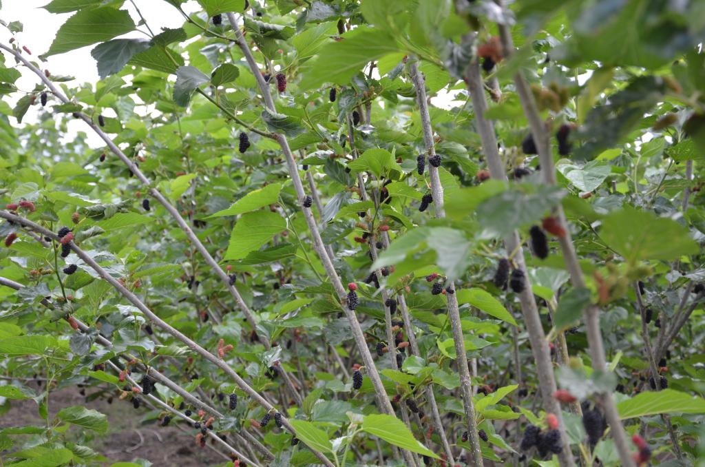 龙华果桑园位于苏家村委会,从杨家桥转入西边的苏家村,顺着蜿蜒的小路,远远的就看到一片翠绿的海!宽大的叶片在阳光下遮遮掩掩,一粒粒饱满艳丽的果桑若隐若现。