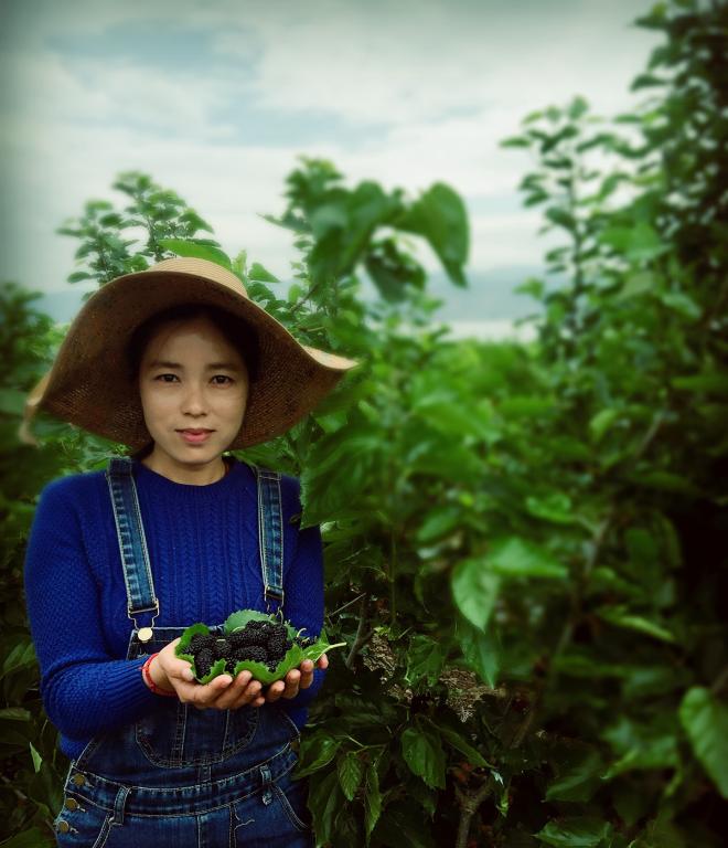 中和村的小磊有机农庄,离县城约有7公里,从沙墩寺桥向西走500米就到了。进入庄园,小路两边成片的桑树,风动处,绿波之上闪动着无数红的与紫的光点,那可全是甜美多汁桑葚哦!