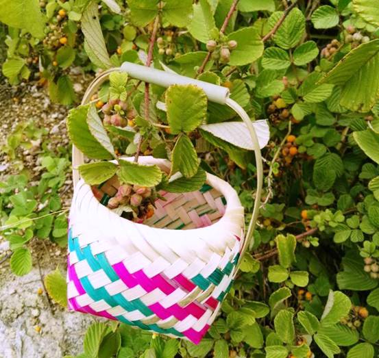 施甸人对黄果儿的喜爱情有独钟,没有任何一种果子能有特制的果篮,而黄果儿就有这样优渥待遇。黄果儿成熟的季节,施甸的竹编艺人便为黄果儿编制起篮子来,我们叫它“花提篮儿”。极薄的白篾片经纬交织围成小筐,青篾片穿竹节做成手柄,再用毛笔蘸上湖蓝色和枚红色涂料在纬线上次第交错涂开,“花提篮儿”春色摇曳,轻巧便利。
